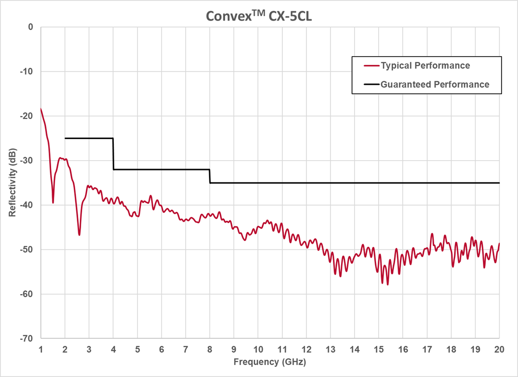 ETS-Lindgrens Convex is designed to provide reflectivity performance of up to 35dB or greater and minimizes low forward scattering characteristics at incident angles up to 60 degrees or greater from normal incidence at microwave and millimeter-wave frequency ranges.