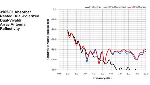 This antenna is designed to be nested in the anechoic absorber lining of a chamber. Installed in this configuration, the model 3165-01 antenna exhibits very low reflectivity, even when the input ports are mismatched. The normal incidence reflectivity is approximately -40 dB for a majority of the frequency range.