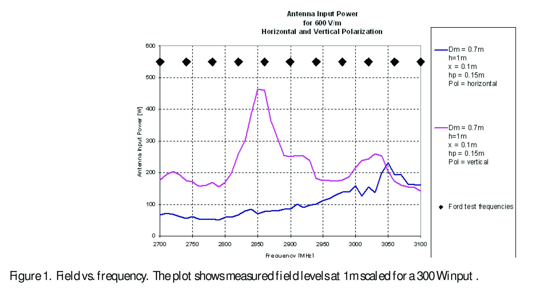 Because of near field gain compression, most horns fail to meet this specification at the required test distance. The Model 3162-02 optimizes the near field behavior to overcome this problem, and produces a field level of 600 V/m with input power of less than 300 W.