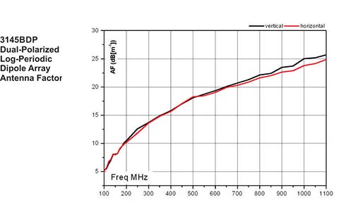 ETS-Lindgren's Model 3145BDP Dual-Polarized Log-Periodic Dipole Array (LPDA) is a dual linearly polarized, broadband log antenna designed to operate over the frequency range of 100 MHz to 1.1 GHz. The choice of scaling factors, the various diameters of each element, and the center-to-center spacing of the booms result in excellent VSWR characteristics throughout the operating frequency range.