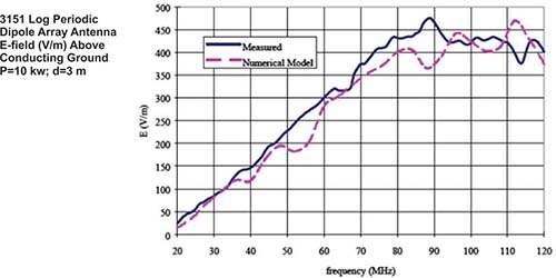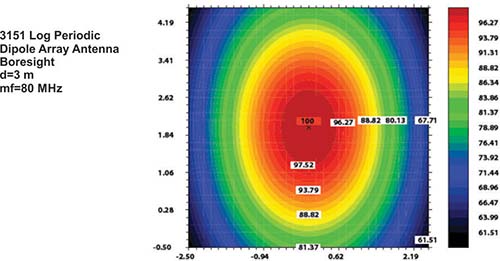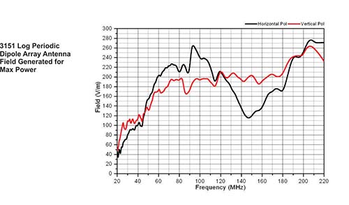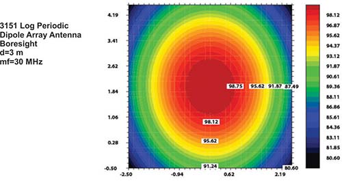 The model 3151 is used for both horizontal and vertical polarizations. The phase center /source position of the antenna shifts from the rear to the front end of the boom as frequency increases. To ensure a high field strength at the low frequency range (30 MHz to 45 MHz), the LPDA antenna needs to be placed at a close distance. However, the beam width of the antenna gets narrower at higher frequencies. Therefore, the antenna needs to be placed at a farther distance at higher frequencies to cover a larger uniform area. If the same distance is kept for the high and low frequency ranges, the field uniformity is compromised above 80 MHz.
