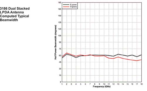The model 3186 was designed to provide a very constant illumination from 1 GHz to 18 GHz. The Beamwidth in the two principal planes is 59.8 degrees for the E-plane (the polarization plane) and 57.0 degrees for the H-plane (the orthogonal plane) while the directivity is about 10 dB across the entire frequency range.
