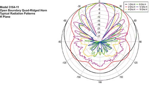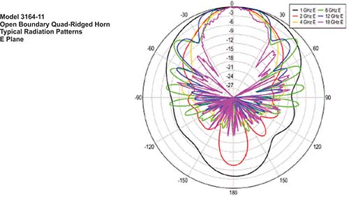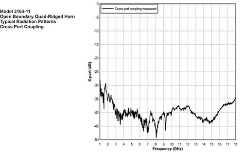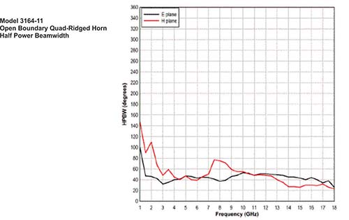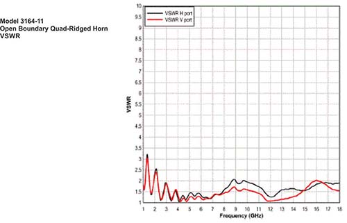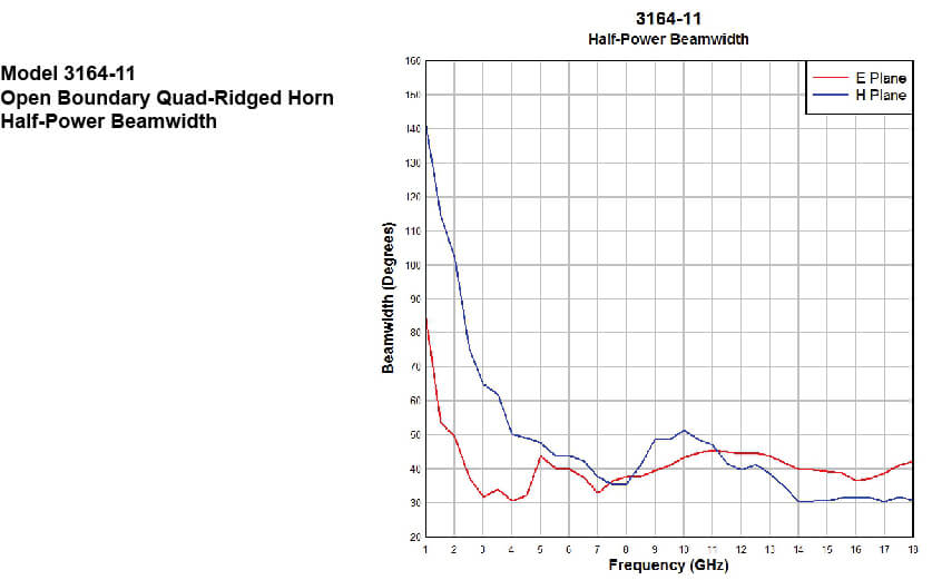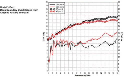 Like other open boundary quad-ridged horns, the 3164-11 exhibits a very flat gain as it changes less than 2 dB for over 80% of the upper part of the frequency range.