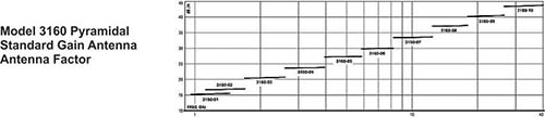 ETS-Lindgren's model 3160 Standard Gain Horns cover a multi-octave bandwidth of 1 GHz to 40 GHz. All models in the series are linearly polarized, have medium gain, optimum half power beamwidth (equal in both horizontal and vertical planes), and low VSWR. Antenna factors are constant throughout the entire operating frequency range. Comparisons of measured versus computed gain have been found to be within +/- 0.5 dB. ANSI C63.4 recommends the use of standard gain horn antennas as a reference standard above 1 GHz.