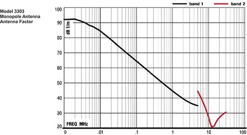 ETS-Lindgren's Model 3303 Passive Broadband Electric Field Monopole is a transmitting antenna with a frequency range of 1 kHz to 30 MHz.this antenna features manual bandswitching between 0.001 to 5 MHz and 5 to 30 MHz. The maximum power handled by the Model 3303 is 1 kW. The transmitting rod is stainless steel can be adjusted to 100 cm (39.4 in) or 104 cm (41 in). The base is an aluminum housing which contains the bandswitching mechanism and a female Type N connector. The model 3303 also may be used as a passive receiving antenna.