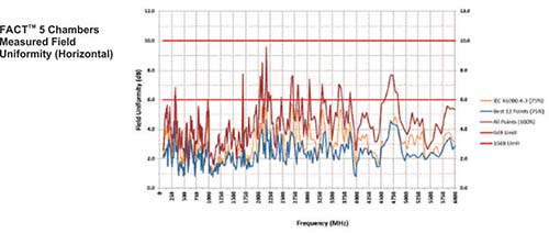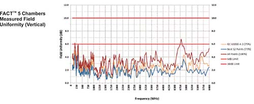 FACT 5 chambers can also be used to perform full compliance testing for IEC 61000-4-3/EN61000-4-3, SAE J-551 requirements. At 3 meter test distance lengths, Field Uniformity (FU) of 0 to 6 dB can be achieved over the frequency range of 26 MHz to 18 GHz. The test aperture for FU is a vertical plane of 1.5 m x 1.5 m at an elevation of 0.8 m to 2.3 m above the ground plane, following the field uniformity test procedure of IEC 61000-4-3. Additionally, used absorber material can safely withstand continuous field intensity of up to 200 V/m and intermittent field intensity of up to 500 V/m. This safely exceeds the field intensity requirements of commercial RI tests.