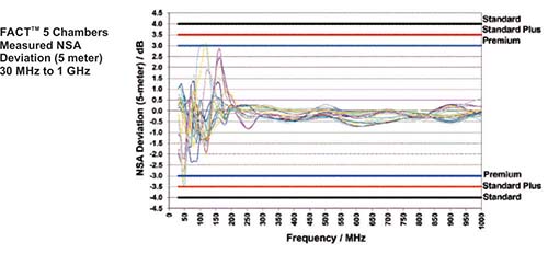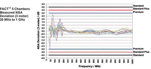 FACT 5 chambers can be used to perform full compliance testing for ANSI C63.4, FCC Parts 15 and 18, EN 50147-2, CISPR 11/EN 55011, CISPR 16/EN55016, CISPR 22/EN55022, CISPR 32/EN55032, VCCI V-3/2003.04, SAE J551 and SAE J1113. ETS-Lindgren guarantees that the performance of Normalized Site Attenuation (NSA) testing according to ANSI C63.4 with 5 meter test distance, is 4.0 dB for STANDARD chamber, 3.5 dB for STANDARD PLUS chamber and 3.0 dB for PREMIUM chamber over the frequency range of 30 MHz to 1 GHz. The guaranteed performance for Site VSWR (sVSWR) test per CISPR 16-1-4 (ANSI C63.4) for frequency range of 1 GHz to 18 GHz is < 6.0 dB, regardless which performance option is selected below 1 GHz.