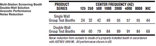 Double wall acoustic booths provide increased isolation when ambient conditions prohibit a single wall configuration to meet ANSI specifications. Double wall acoustic booths also provide additional acoustic control to isolate patients from waiting room noise outside.