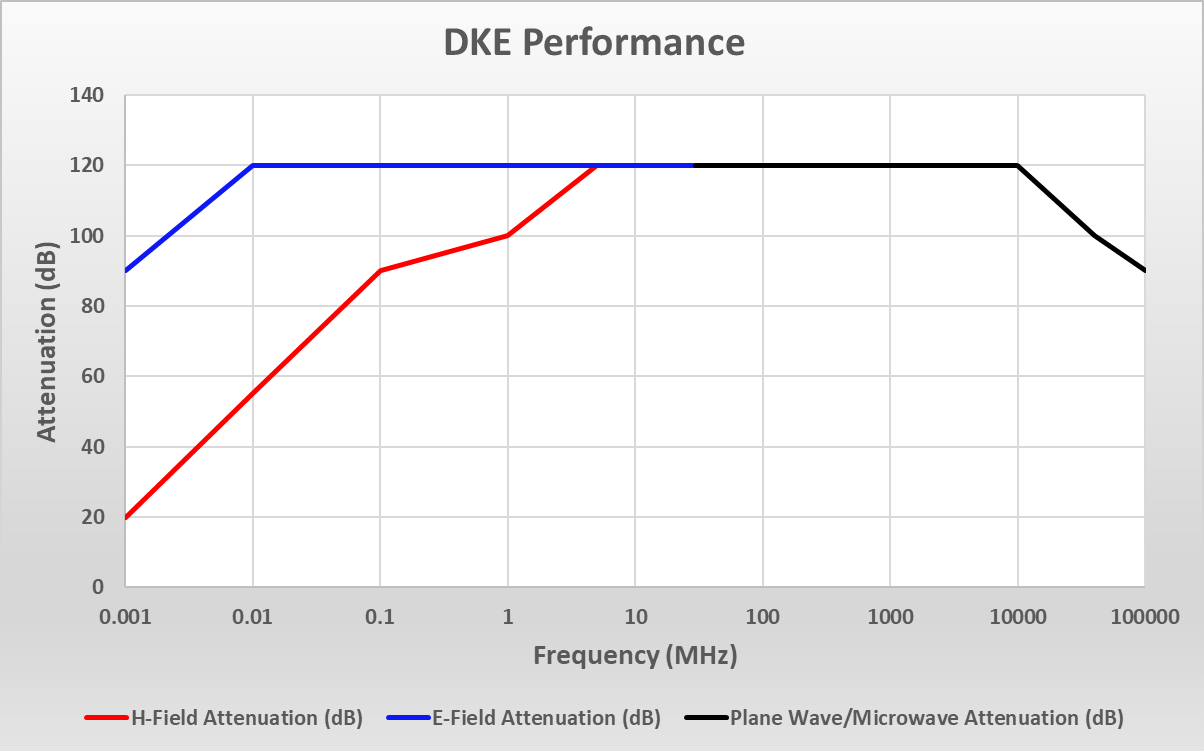 The DKE maintains 120 dB attenuation to 10 GHz, 100 dB at 40 GHz, and 90 dB to 100 GHz. When tested in accordance with MIL-STD 285/IEEE-299, the DKE design exceeds the test requirements of NSA-94-106 and CID/09/12A.